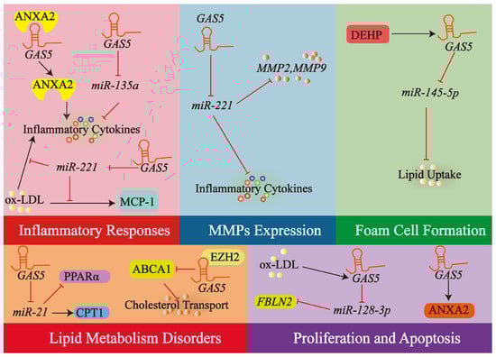 As mentioned above, GAS5 can widely regulate the progression of different diseases, including cardiovascular diseases, through various mechanisms. To illustrate, elevated concentrations of GAS5 are detected in rat models of atherosclerosis. In experimental studies using apolipoprotein E-deficient (ApoE−/−), mice demonstrated that high-fat diet feeding induces atherosclerosis development, with subsequent analysis revealing significantly elevated GAS5 expression levels in blood samples from atherosclerotic mice compared to control groups []. This observed upregulation of GAS5 suggests its potential involvement in regulating atherosclerotic progression.