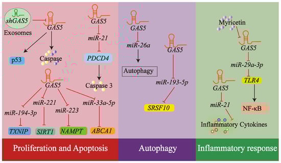 As a versatile ceRNA, GAS5 binds multiple miRNAs such as miR-21 [], miR-96-5p [], and miR-28a-5p [], effectively neutralizing their ability to repress target genes []. This sponge-like activity enables GAS5 to broadly regulate downstream signaling networks.
