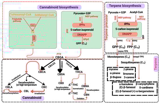 A simplified schematic representation of the cannabinoid and terpene biosynthetic pathways in Cannabis sativa L. Cannabinoid precursors and biosynthesis: The path begins with olivetolic acid (OA), formed from tetraketide (TK) via tetraketide synthase (TKS) and olivetolic acid cyclase (OAC). Geranyl pyrophosphate (GPP), synthesised by geranyl pyrophosphate synthase (GPPS) from dimethylallyl pyrophosphate (DMAPP) and isopentenyl diphosphate (IPP) through the methylerythritol phosphate (MEP) pathway, is transferred to OA by PT4 (geranylpyrophosphate: olivetolate geranyltransferase 4) to form cannabigerolic acid (CBGA), the central cannabinoid precursor. CBGA is converted into major cannabinoids: cannabidiolic acid (CBDA) via CBDA synthase (CBDAS), tetrahydrocannabinolic acid (THCA) via THCA synthase, and cannabichromenic acid (CBCA) via CBCAS. Following non-enzymatic decarboxylation yields active cannabinoids such as cannabidiol (CBD), Δ9-tetrahydrocannabinol (Δ9-THC), and cannabichromene (CBC), among others. Minor cannabinoids include cannabinol (CBN), cannabicyclol (CBL), and their acidic precursors (CBNA, CBLA). Terpene precursors and synthesis: Terpenes derive from the cytosolic mevalonate (MEV) and plastidial MEP pathways. Farnesyl diphosphate (FPP), synthesised by farnesyl pyrophosphate synthase (FPPS), and GPP, serve as key precursors. Terpene synthase (TPS) enzymes catalyse the formation of diverse mono- and sesqui-terpenes that contribute to the plant’s aroma and therapeutic properties.
