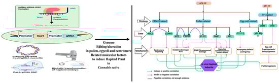 Haploid induction occurs early during seed development, facilitated by genes regulating meiosis, fertilisation, gamete interaction, and chromosomal integrity. Enhancements in this area have led to the creation of specialised haploid inducer lines. However, the underlying mechanisms remain complex and often species-specific, limiting the universality of existing haploid systems. The emergence of genome editing platforms, especially CRISPR/Cas9, exhibits new possibilities for inducing haploidy in genetically recalcitrant crops such as C. sativa. The direct editing of gametes or haploid embryos can enhance editing efficiency and enable the rapid generation of null homozygous lines following chromosome doubling [26,27,28]. This review synthesises recent advancements in maternal and paternal haploid induction in Cannabis sativa, emphasising the genetic, molecular, and technological frameworks essential for establishing robust haploid inducer systems. In particular, it emphasises the application of these tools in breeding programs aimed at improving cannabinoid biosynthesis and accomplishing genetic uniformity in hemp cultivation.