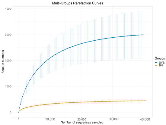 Multi-group rarefaction curves between two groups. DYB: white crane group; BH: common crane group.