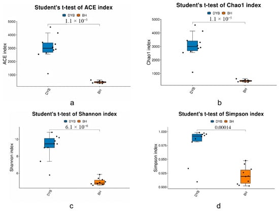 α-diversity analysis index of two groups. (a) ACE index; (b) Chao1 index; (c) Shannon index; (d) Simpson index; DYB: white crane group (10 samples); BH: common crane group (10 samples).