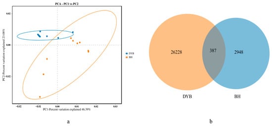 Venn diagram analysis among groups (a) and PCA (b). (a): Structural differences in bacterial communities among the groups were assessed using PCA based on the weighted UniFrac distance metric. The value in percentage indicates the contribution of PC1 to the variability. Y-axis: Second principal component. The value in percentage indicates the contribution of PC2 in variability; (b): DYB: white crane group; BH: common crane group.