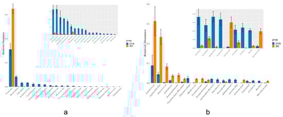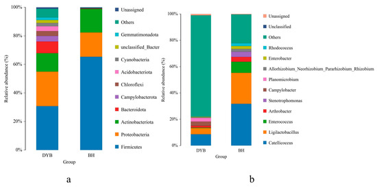 Relative abundance of the dominant bacterial at the phylum (a) and genus (b) levels. Note: X-axis: sample IDs; Y-axis: relative abundance. DYB: white crane group; BH: common crane group. Unassigned means the organism/sequence was analyzed but cannot be placed into any defined taxonomic group; unclassified means the organism/sequence lacks sufficient data for taxonomic placement, often due to technical limitations; Others: a catch-all category for sequences that do not fit into predefined categories of interest in the study.