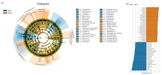 LEfSe analysis of the specific bacterial community between the two groups. (a) LEfSe biomarkers in cladogram. (b) LEfSe biomarkers in strict. Note: the circles from the center to the outward layers represent taxonomic levels from phylum to species. The node on the circles represents a term on the corresponding taxonomic level. The size of the dots indicates relative abundance. Coloring: Species with no significant difference are colored in yellow. Otherwise, the nodes are colored according to the group with the highest relative abundance, which helps visualize the relevance of different biological aspects. DYB: white crane group; BH: common crane group.