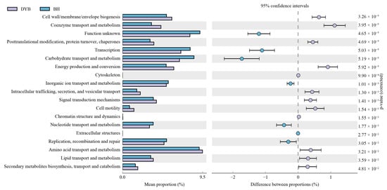 PICRUSt2 predicts microbial metabolic functions through COG analysis between the two groups. Note: the left figure shows the abundance proportion of different functions in two groups of samples, the middle figure shows the difference in proportion of functional abundance within the 95% confidence interval, and the value on the far right is the p-value. DYB: white crane group; BH: common crane group.