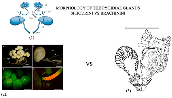(1). General appearance of the pygidial glands of Sphodrini ground beetles. Abbreviations: ed—efferent duct; lmcc—lumen of main collecting canal; mcc –main collecting canal; ov—opening valve; r—reservoir; rcc—radial collecting canal; sl—secretory lobe; sr—spiral ridge [110]. (2). Pygidial glands of Calathus fuscipes: (A) a cluster of the secretory lobes; (B) the reservoir and the efferent duct; (C) a close-up view of the secretory lobes; (D) a close-up view of the junction of the reservoir and the efferent duct (ed—efferent duct; lmcc—lumen of main collecting canal; mcc—main collecting canal; ov—opening valve; r—reservoir; sc—secretory cells; sl—secretory lobes. Scales: (A,B) 0.5 mm; (C) 100 μm; (D) 50 μm [110]. (3). Pygidial gland and accessory components of the bombardier beetle defense system (after Forsyth). Scale bar = 1.0 mm [111].
