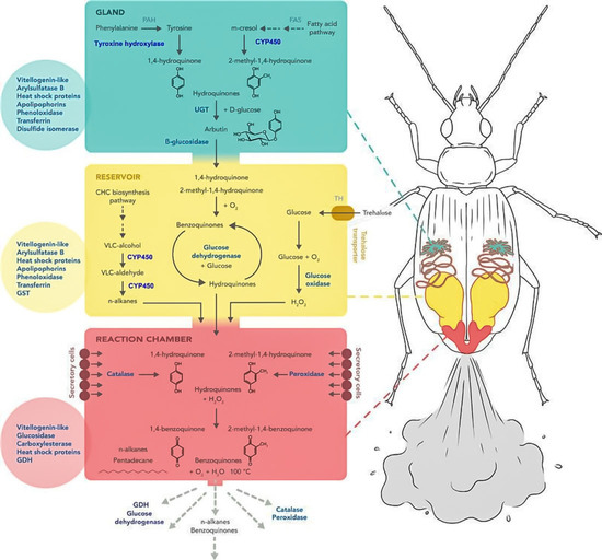 Proposed molecular basis of defensive gland secretions in the bombardier beetle B. crepitans based on combined transcriptomic and proteomic analysis. The principal reactions in the MGS with gland (green), RC (yellow) and RXC (red) are shown in black, with candidate genes identified in the transcriptome and the corresponding proteins identified by proteomic analysis shown in blue. The circles show additional abundant proteins identified in the corresponding parts of the defensive gland [109].