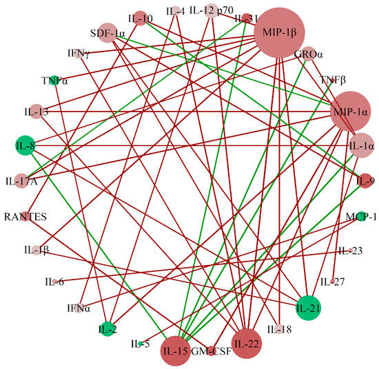 A network of cytokine interactions was established in urine samples of patients with preterm and term delivery. Network of perturbed cytokine concentration correlations between the group with preterm delivery (<37 weeks) and the group with term delivery (>37 weeks). Each node (sphere) represents one analyte; the node color indicates the direction of concentration change in the preterm group relative to the term group (red: increased; green: decreased), and color intensity reflects the magnitude of this change. Links (lines) connect cytokine pairs whose partial correlation differs significantly between groups: red links represent a gain of correlation in preterm vs. term delivery, while green links indicate a loss of correlation. Node size is proportional to the number of perturbed correlations involving that cytokine, i.e., the node’s degree in the network, reflecting its statistical centrality.