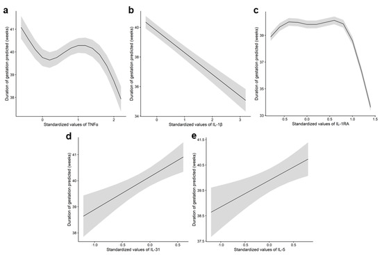 Association between TNFα in amniotic fluid and IL-1β, IL-1Ra, IL-31, and IL-5 in urine samples with pregnancy duration. Graph depicting the relationship between (a) amniotic fluid concentrations of TNFα and pregnancy duration, and relationship of urine concentrations of (b) IL-1β, (c) IL-1Ra, (d) IL-31, and (e) IL-5 with pregnancy duration. The line represents the marginal mean of the gestation duration as predicted by the GAMLSS model (μ), while the shaded area indicates the 95% confidence interval. Given the considerable variability observed in the cytokine data, the values were standardized to a uniform scale, with mean at 0 and standard deviation at 1, as previously described by Kuhn et al. (2013) [22].