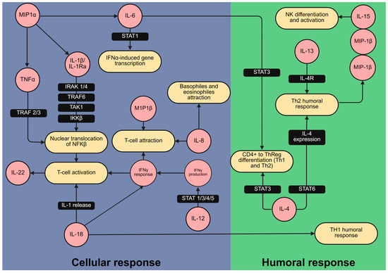 Cytokines related to cellular and humoral inflammatory responses varied between preterm delivery and at term delivery patients. Mapping of cytokines (in red) associated with the duration of pregnancy and likelihood of preterm delivery within the immunological signaling network. The network was created using the Reactome pathway database [38], which provides a curated collection of established signaling pathways and interactions. This mapping illustrates their involvement in cellular (blue) and humoral (green) immune responses relevant to preterm labor. Figure created with BioRender.com.