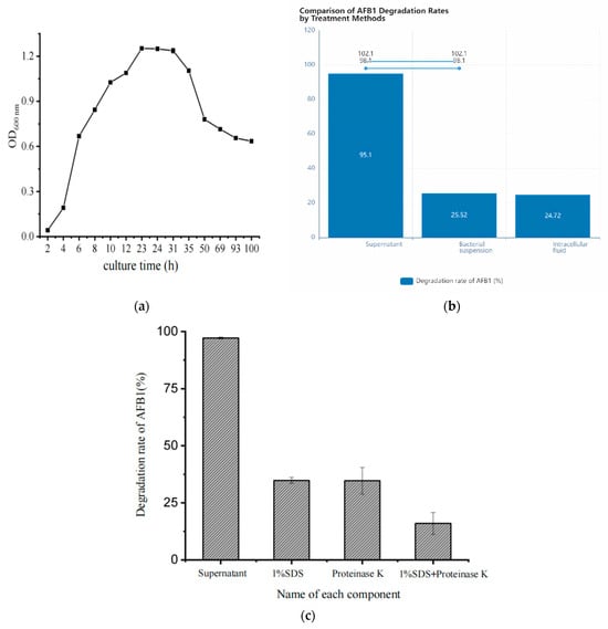 Determination of degradation conditions. Growth curves of different groups (e.g., experimental vs. control) were compared by repeated measures analysis of variance (RM-ANOVA, p < 0.01). (a) Growth curve of Myroides odoratimimus 3J2MO. (b) Comparison of the degradation rate of AFB1 by each component of the fermentation broth. (c) The effect on the degradation rate of AFB1 by treating the crude enzyme solution with different denaturation methods.