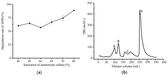 Through the determination of the distribution of the degradation component of the strain, the degradation conditions and degradation rate of the component will be screened and used for comparative analysis. AFB1 degradation rate experiments revealed the change rule of AFB1-degrading enzyme activity in the precipitation fractions of ammonium sulfate with different saturation degrees (Figure 2a). The saturation degree of ammonium sulfate was between 60 and 80%, the precipitated protein was positively correlated with the degradation rate of AFB1, and 80% saturated ammonium sulfate precipitated protein had the best ability to degrade AFB1, with a degradation rate of 80%. Therefore, 80% saturated ammonium sulfate was chosen as the best condition for precipitating proteins.