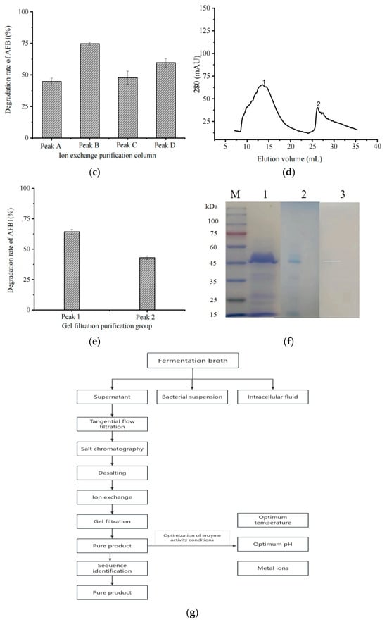Enzyme purification. Using repeated measures ANOVA (RM-ANOVA, p < 0.01), group and time effects were significant, and further differences in degradation rates across groups at specific groups and time points were compared by Tukey et al. (a) Effect of crude enzyme solution treated with different saturations of ammonium sulfate on the degradation rate of AFB1. (b) Ion-exchange chromatography purification results. Note: The crude enzyme solution was separated and purified by a Q-Sepharose Fast Flow chromatography column, and the four components were named peak A, peak B, peak C, and peak D, respectively. (c) AFB1 degradation rate of peak A, B, C, and D in ion-exchange chromatography. (d) Fluorescence values of two enzyme components, components 1 and 2, separated by gel filtration chromatography. (e) AFB1 degradation rate of peak 1 and 2. (f) Electropherogram of purified degradative enzyme. Note: M denotes the protein molecular weight marker (kDa); 1, crude enzyme solution; 2, ion-exchange chromatography peak B; and 3, gel filtration chromatography peak 1. (g) Enzyme purification process.