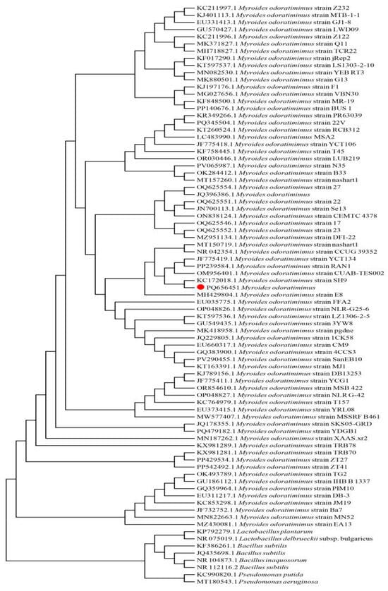 The search parameters were as follows: fixed modification carbamidomethyl (C); variable modification oxidation (M); acetyl (protein N-term); and trypsin/P for digestion. The primary mass spectrometry matching tolerance was set at 20 ppm for the initial search, and the secondary mass spectrometry matching tolerance was also set at 20 ppm, with the primary search set at 4.5 ppm. The search results were filtered by 1% FDR at the protein and peptide level, and entries of contaminated proteins, anti-column proteins, and proteins with only one modified peptide were deleted. The remaining identification information was used for subsequent analyses [,]. The Myroides odoratimimus 3J2MO strain was sent to Shanghai Sangon Biotech Co., Ltd. (Shanghai, China) for sequencing. The 16S rRNA coding sequence of the Myroides odoratimimus 3J2MO strain was registered on the National Center for Biotechnology Information (NCBI) website (accession number: PQ656451), and was used as a query sequence for BLAST (BLAST+ 2.14.0) analysis in Myroides odoratimimus genomes available on NCBI. Seventy-two 16S rRNA coding sequences with high homology with the 3J2MO strain were selected and downloaded. Meanwhile, eight 16S rRNA coding sequences from representative strains which have been reported to have AFB1-degradation activities were also downloaded and used for cluster analysis. After alignment, all 16S rRNA coding sequences from a total of 81 strains were used to construct a phylogenetic tree using the neighbor-joining (NJ) method in MEGA-X (MEGA 6) software (bootstrap replications of 1000 and a partial detection threshold of 50).