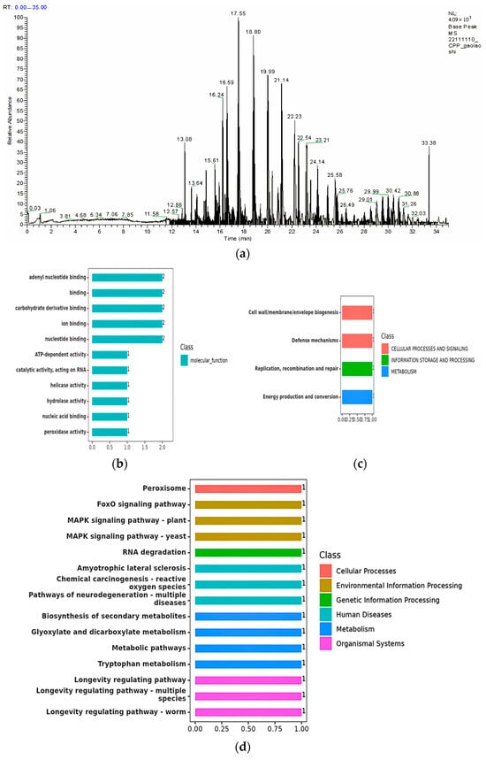The KEGG database (Table 6) described two validated proteins: the protein of 3J2MOGL003364 was found to have peroxidase activity [EC:1.11.1.6] and the protein of 3J2MOGL000150 was searched and found to have ATP-dependent RNA helicase enzyme activity [EC:3.6.4.13]. The KEGG database is functionally annotated (Figure 4d), with different colors indicating different pathways, and there are six categories. Four of them are involved in metabolism, namely secondary metabolite synthesis, carbon metabolism, tryptophan metabolism, and glyoxylate and dicarboxylic acid metabolism. All of them are related to environmental information processing: the Fox0 pathway, the plant-MAPK signaling pathway, and the yeast-MAPK signaling pathway, respectively. Three of them have functions related to human diseases, namely neurodegenerative pathways in various diseases, chemical carcinogenesis by reactive oxygen species, and amyotrophic lateral cord sclerosis. Three functions involved in organic systems of organisms are the longevity regulation pathway, longevity regulation pathway of multiple species, and longevity regulation pathway of worms. Involved in the processing of genetic information is the degradation of RNA, and the function associated with the cellular process is the peroxisome. The KEGG database is more detailed in annotating the functions of proteins, showing more metabolic pathways [,].