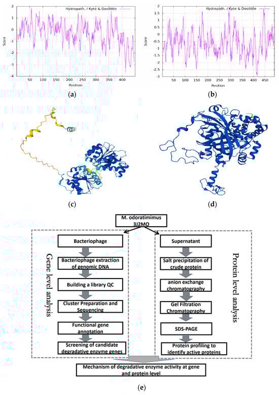 Analysis of the structure of enzymes. (a) 3J2MOGL000150 analysis of protein hydrophilicity and hydrophobicity. (b) 3J2MOGL003364 analysis of protein hydrophilicity and hydrophobicity. (c) 3J2MOGL000150 tertiary structure. (d) 3J2MOGL003364 tertiary structure. (e) Overall process of 3J2MO degradation enzyme mechanism method study.