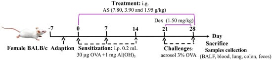 A total of six groups (n = 7) were randomly formed among the animals. The experimental groups consisted of a normal control group, an OVA-induced asthma model group, a positive control drug group receiving Dex treatment (administered as an aqueous solution at a dosage of 1.50 mg/kg), and three experimental groups subjected to different dosages of AS. Specifically, the high-dose group was given 7.80 g/kg of AS, the medium-dose group received 3.90 g/kg, and the low-dose group was administered 1.95 g/kg (Table 1). According to the dose used in clinical practice [30] and the results of the preliminary test, this dose was the effective dose in terms of the amount of crude drug. An OVA-sensitized allergic asthma model was successfully generated using a well-characterized immunization and challenge protocol adapted from published methods and the results of our pre-experiments [31]. After a one-week adaptive feeding period, on days 0, 7, and 14, all mice received intraperitoneal injections of 0.2 mL of normal saline which contained 30 µg of OVA and 1 mg of Al(OH)3 for sensitization, except for those in the control group. Subsequently, from days 21 to 28, a nebulizer was used to aerosolize a 3% OVA saline challenge solution onto the mice for 30 min each time. Meanwhile, Dex was given orally to the mice 1 h before their exposure to the OVA challenge. An equivalent quantity of saline was given to the control group. Meanwhile, the treatment groups were administered different doses of AS by gavage 1 h before OVA stimulation from day 0 to day 28 (Figure 1).