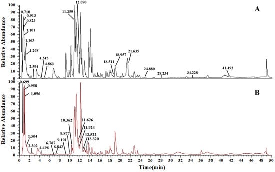 TIC diagram of AS. (A) Positive electrospray ionization (ESI+) mode. (B) Negative electrospray ionization (ESI−) mode.