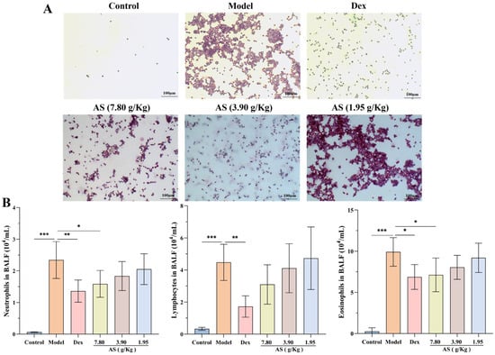 Following OVA stimulation, a marked increase in the count of neutrophils, lymphocytes, and eosinophils within the BALF of the model group was observed (Figure 3A,B). Conversely, after the administration of Dex and the high dose of AS, a significant reduction in the number of inflammatory cells in the BALF was noted, with neutrophils and eosinophils showing a particularly pronounced decrease (p < 0.05). Even though there was no statistically significant disparity, the quantity of lymphocytes was also conspicuously lower when compared with that in the model group. These results indicate that AS lessens the infiltration of inflammatory cells within the lungs of mice suffering from asthma.