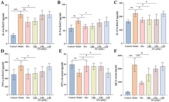 Effects of AS on cytokines in asthma mice. (A–E) Levels of BALF inflammatory cytokines (IL-4, IL-5, IL-13, TNF-α) and serum IFN-γ. (F) Serum immunoglobulin E (IgE) concentration. The data are presented as mean ± SD (n = 7). * p < 0.05, ** p < 0.01, *** p < 0.001.