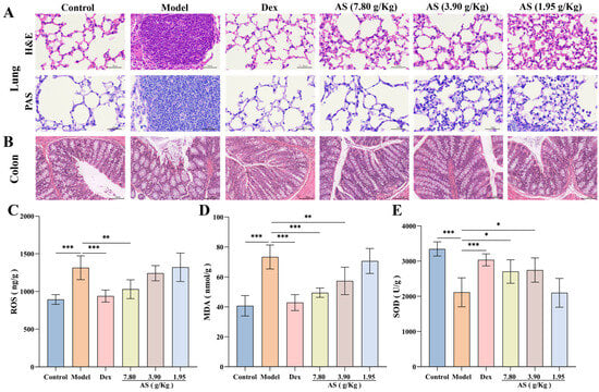 Influences of AS on the lung, colon tissues, and the levels of oxidative stress. (A) H&E and PAS staining of lung tissue (400× magnification; scale bar: 50 µm). (B) H&E staining of colon tissue (200× magnification; scale bar: 100 µm). (C–E) The concentrations of ROS, MDA, and SOD in the lung. The data are presented as mean ± SD (n = 3~7). * p < 0.05, ** p < 0.01, *** p < 0.001.