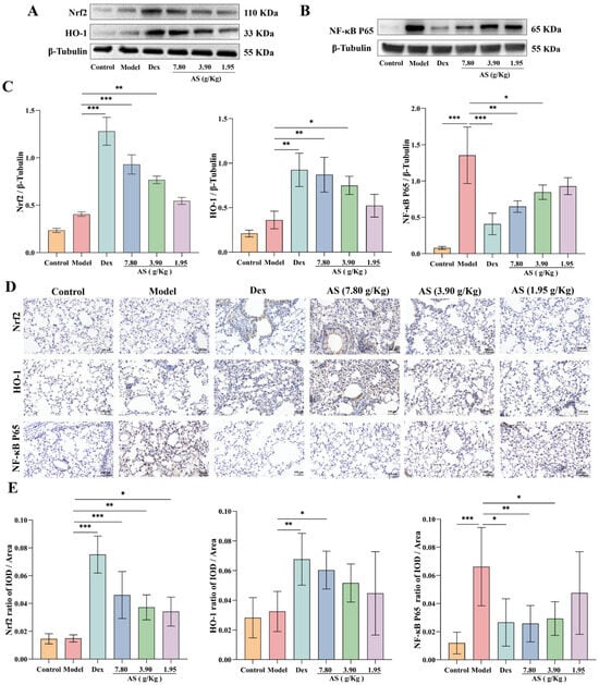 Western blot analysis demonstrated that both Dex and AS treatment significantly enhanced Nrf2 nuclear translocation and HO-1 protein expression in lung tissues compared to the model group (Figure 6A,C). The immunohistochemical results of mouse lung samples also confirmed the conclusion (Figure 6D,E). As illustrated in Figure 6, the NF-κB p65 protein level in the model group was significantly higher than that in the control group (p < 0.001), indicating that an inflammatory response occurred in the model group. However, after the treatment with Dex and AS (7.80 g/kg and 3.90 g/kg), the expression of NF-κB p65 in the nucleus decreased significantly (Figure 6B,C, p < 0.05). Furthermore, the immunohistochemical results further indicated that AS could inhibit the nuclear translocation of NF-κB p65. This indicates that AS possesses anti-oxidative stress and anti-inflammatory properties.