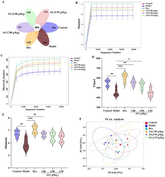 AS modulates the alterations of gut microbiota in mice with asthma. (A) Venn diagram. (B,C) Observed_features and Shannon curves difference group. (D,E) Analysis of the α–diversity of the gut microbiota by the Chao1 and Shannon index. (F) PCoA analysis. The data are presented as mean ± SD (n = 5). * p < 0.05, ** p < 0.01, *** p < 0.001.