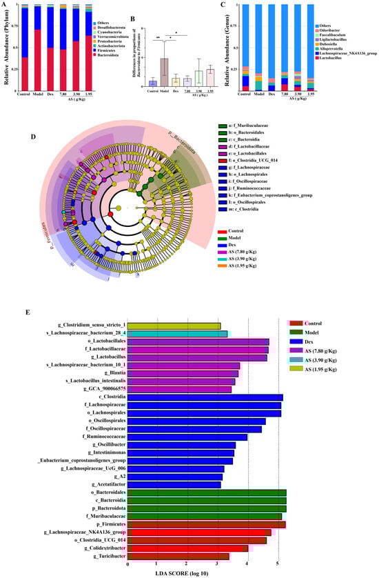 Impacts of AS on the composition of mouse intestinal microbiota. (A) Analysis of the community composition at the phylum level. (B) The ratio of Bacteroidota to Firmicutes. (C) Analysis of the community composition at the genus level. (D) Statistical chart of LEfSe analysis. (E) LDA discriminant result histogram. The data are presented as mean ± SD (n = 5). * p < 0.05, ** p < 0.01.