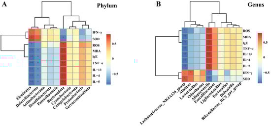Correlation analysis between cytokines, oxidative stress levels, and microbiota. (A) At the phylum level; and (B) At the genus level. The data are presented as the mean ± SD (n = 5). * p < 0.05, ** p < 0.01.