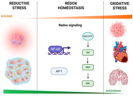Continuum of reductive stress, redox homeostasis, and oxidative stress. A schematic overview of cellular redox biology illustrating how varying levels of reactive oxygen and nitrogen species (ROS/RNS) influence physiological and pathological outcomes. Reductive stress (left): low ROS/RNS levels can lead to immune suppression (e.g., impaired neutrophil function) and altered stromal cell activity, potentially contributing to tissue dysfunction. Redox homeostasis (center): balanced ROS/RNS engage redox-sensitive signaling pathways—including nuclear factor κB (NF-κB), activator protein-1 (AP-1), and the RAS–RAF–MEK–ERK (extracellular signal-regulated kinase) kinase cascade—that regulate gene expression, cell survival, and adaptive responses. Oxidative stress (right): excessive ROS/RNS overwhelm antioxidant defenses and drive inflammation, tumorigenesis, cardiovascular injury, and neurodegeneration. The orange gradient above indicates relative ROS/RNS levels, while the green gradient below reflects the capacity of endogenous antioxidants (e.g., superoxide dismutase, catalase, glutathione peroxidase, thioredoxin, glutaredoxin, glutathione, vitamins C and E). Created with BioRender.com.