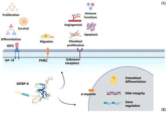 - IGF-independent actions: IGFBP-6 modulates cell migration through its interaction with prohibitin-2 (PHB2), independently of IGF-2 binding. Additionally, it influences angiogenesis, fibroblast proliferation, and apoptosis, though the receptors mediating these immune-related effects remain unidentified [84,85].
