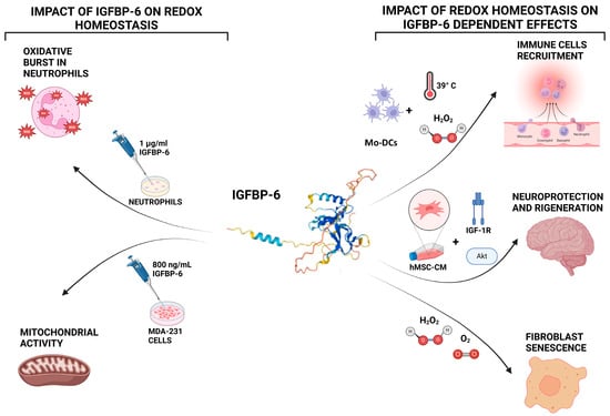 The interplay between IGFBP-6 and redox homeostasis represents a complex regulatory network, where IGFBP-6 both influences and responds to oxidative stress, shaping cellular functions such as immune response, proliferation, differentiation, and survival. One example of IGFBP-6’s involvement in redox regulation is its response to hyperthermia. When exposed to hyperthermic conditions, IGFBP-6 is rapidly secreted in microvesicles and exosomes, with secretion occurring within three hours. Interestingly, IGFBP-6 has been detected in the conditioned medium of monocyte-derived DCs exposed to both hyperthermia and hydrogen peroxide. This finding suggests that mild oxidative stress may serve as a trigger for immune cell communication through IGFBP-6 and extracellular vesicles (EVs), highlighting its role in immune modulation and redox homeostasis [87].