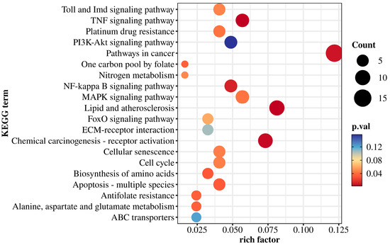 According to the KEGG enrichment results (Figure 5), DEGs were mapped to several signaling and metabolic pathways. Immune and stress-related pathways included the Toll and Imd signaling pathways, TNF signaling pathway, PI3K-Akt pathway, MAPK pathway, NF-κB signaling, and FoxO pathway. These enrichments suggest that low-salinity stress may trigger immune and inflammatory responses in M. yessoensis.