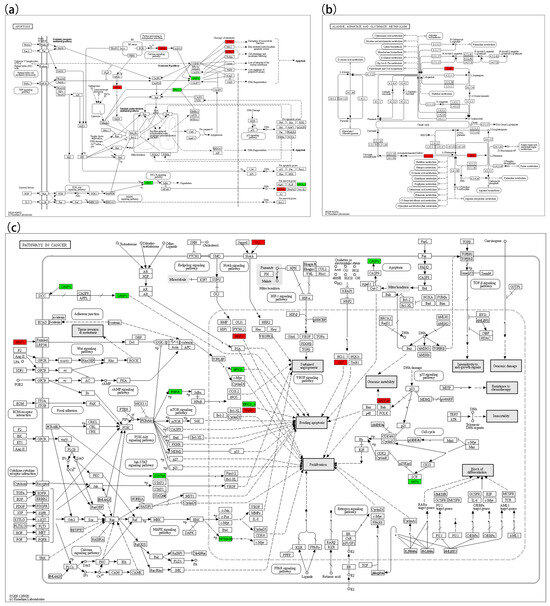 KEGG map 2. (a) Represents Apoptosis (map4010); (b) represents the Alanine, Aspartate and Glutamate Metabolism pathway (map00250); (c) represents Pathways in cancer (05200).
