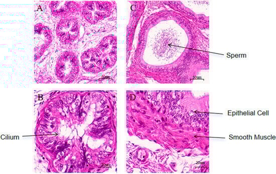 - James, E.R.; Carrell, D.T.; Aston, K.I.; Jenkins, T.G.; Yeste, M.; Huetos, A.S. The role of the epididymis and the contribution of epididymosomes to mammalian reproduction. Int. J. Mol. Sci. 2020, 21, 5377. [Google Scholar] [CrossRef]