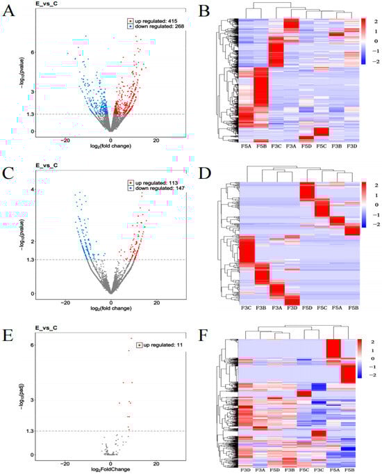 Volcano plots and cluster heatmaps of DEmRNAs, DELncRNAs, and DEmiRNAs. (A) Volcano plot of DEmRNAs; (B) Cluster analysis of DEmRNAs; (C) Volcano plot of DELncRNAs; (D) Cluster analysis of DELncRNAs; (E) Volcano plot of DEmiRNAs; (F) Cluster analysis of DEmiRNAs. Note: In (A,C,E), “up” and “down” indicate upregulated and downregulated gene expression in epididymal tissues of the before and after sexually mature Junggar Bactrian camels. In (B,D,F), the horizontal axis represents individual samples and the vertical axis represents expression levels; the color gradient from blue to red indicates increasing expression levels.