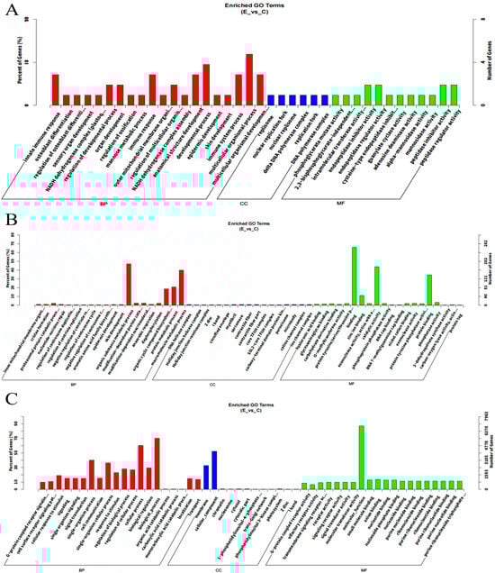GO annotation of DEmRNAs, DELncRNAs, and DEmiRNA. (A) GO annotation of DEmRNAs; (B) GO annotation of DELncRNAs; (C) GO annotation of DEmiRNAs.