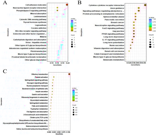 As shown in Figure 4A, GO annotation revealed that DEmRNAs were mainly involved in terms including Multicellular Organismal Process (BP), Developmental Process (BP), and Innate Immune Response (BP). KEGG enrichment analysis (Figure 5A) showed that these DEmRNAs were significantly enriched in pathways such as Cell Adhesion Molecules, Phospholipase D, and Neuroactive Ligand–Receptor Interaction.