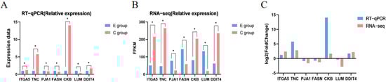 To verify the accuracy of transcriptome sequencing data, this study randomly selected seven differentially expressed genes—ITGA5, TNC, FASN, CKB, LUM, PJA1, and DDIT4 for RT-qPCR validation. As shown in Figure 6, the expression levels of ITGA5, TNC, CKB, and DDIT4 were significantly upregulated (p < 0.05); FASN, LUM and PJA1 were significantly downregulated (p < 0.05). The expression trends of all genes were consistent between RT-qPCR and RNA-seq results, indicating that the sequencing data and expression profiles obtained in this study are reliable and can serve as a foundation for subsequent analyses.