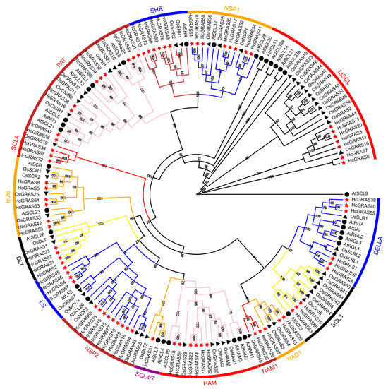 For the purpose of revealing the evolutionary relationship of GRAS genes between A. thaliana, O. sativa and H. citrina, this research set up a neighbor-joining phylogenetic tree in accordance with the 33 AtGRASs from A. thaliana, 56 OsGRASs (Table S1) from O. sativa, and 78 HcGRASs (Table S2) from H. citrina Baroni (Figure 1). The results showed that 78 HcGRASs were clustered into 15 subfamilies: DELLA, SCL3, RAD1, RAM1, HAM, SCL4/7, NSP2, LS, DLT, SCR, SCLA, PAT, SHR, NSP1, and LISCL. HcGRAS1, HcGRAS24, HcGRAS28, HcGRAS38, HcGRAS40 and HcGRAS55 are DELLA subfamily members. HcGRAS2, HcGRAS23, HcGRAS31 and HcGRAS62 are DLT subfamily members. HcGRAS12, HcGRAS22, HcGRAS27, HcGRAS74, HcGRAS48 and HcGRAS59 are HAM subfamily members. The LS subfamily has four members, including HcGRAS4, HcGRAS45, HcGRAS46and HcGRAS57. HcGRAS3, HcGRAS6, HcGRAS7, HcGRAS11, HcGRAS20, HcGRAS44 and HcGRAS71 are LISCL subfamily members. The NSP1 subfamily has eight members, including HcGRAS41, HcGRAS54, HcGRAS17, HcGRAS35, HcGRAS50, HcGRAS52, HcGRAS61, and HcGRAS70. HcGRAS56, HcGRAS75, HcGRAS9, HcGRAS10, HcGRAS14, HcGRAS15, HcGRAS18, HcGRAS39 and HcGRAS77 are members of the NSP2 subfamily. HcGRAS34, HcGRAS67 and HcGRAS72 are SCLA subfamily members. HcGRAS13, HcGRAS29, and HcGRAS37 are RAD1 subfamily members. HcGRAS16, HcGRAS21 HcGRAS25, HcGRAS69, HcGRAS32, HcGRAS36, HcGRAS47, HcGRAS58, HcGRAS65 and HcGRAS78 are PAT subfamily members. HcGRAS26 and HcGRAS30 are RAM1 subfamily members. HcGRAS19, HcGRAS43 and HcGRAS68 are SCL3 subfamily members. HcGRAS51 is an SCL4/7 subfamily member. HcGRAS21, HcGRAS25 and HcGRAS69 are SCL8 subfamily members. HcGRAS5, HcGRAS8, HcGRAS42, HcGRAS53, HcGRAS63 and HcGRAS64 are SCR subfamily members. HcGRAS33, HcGRAS49, HcGRAS60, HcGRAS66, HcGRAS73 and HcGRAS76 are SHR subfamily members.