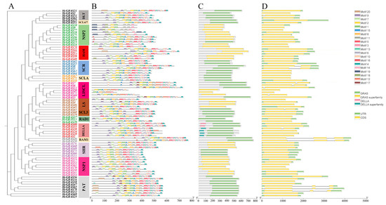 The analysis of phylogenetic relationships, gene structure, and distribution of motifs among HcGRAS genes. The phylogenetic tree was generated using the NJ method with 1000 replicates on each node (A). The conserved motif distribution of GRAS proteins (B); motifs 1–20 are represented by boxes of different colors. The conserved functional domains of HcGRASs (C). Gene structures of HcGRAS genes (D).