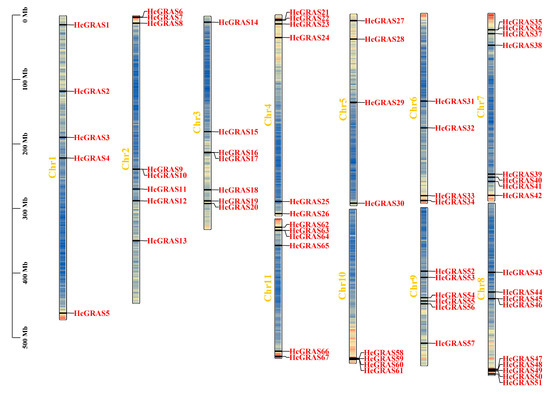 The results indicated that 67 HcGRAS members were not evenly distributed on 11 Chrs and 11 HcGRAS members were evenly distributed at unanchored points. Chr 8 had the most distribution with nine members, followed by Chrs 2 and 7 with eight members, Chr 3 with seven members, Chrs 4, 9 and 11 with six members, Chr 1 with five members, and Chrs 5, 6 and 10 with four members (Figure 3).