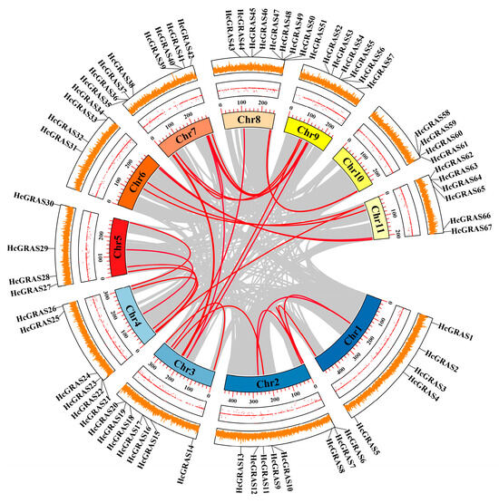 The chromosomal positions and the relationships among different chromosomes concerning GRAS family genes in H. citrina Baroni. Red lines indicate the events of duplication that have been identified.
