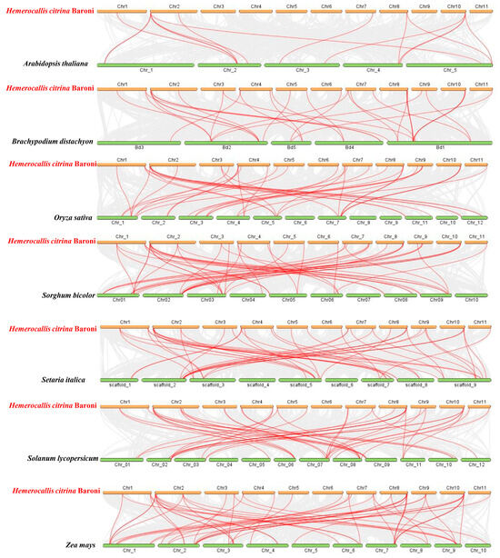 The intra-species collinear analysis was carried out for the purpose of deciding if gene duplication resulted in the HcGRAS gene family’s evolution (Figure 4 and Figure 5). More pairs of duplicated segments were found within HcGRASs, which suggested that segmental duplication played a significant role in genetic diversity. Then, intra-species syntenic maps of H. citrina Baroni that have seven species were constructed to identify orthologous genes using TBtools (Figure 5 and Table S4). A total of 44 HcGRAS genes exhibited collinear relationships with A. thaliana (7), B. distachyon (33), Oryza sativa (32), S. bicolor (33), S. italica (32), S. lycopersicum (31), and Z. mays (27). The orthologous gene pairs identified between daylily and the remaining seven species totaled, including B. distachyon, S. bicolor, S. italica, Arabidopsis, tomato, rice, and maize, were 15, 50, 6, 53, 52, and 55, respectively.
