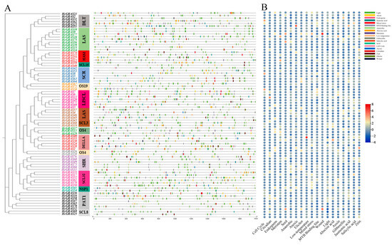 This research set up a phylogenetic tree by selecting A. thaliana AtGRAS, rice OsGRAS and daylily HcGRAS to explore the evolutionary relationships of GRAS TFs in different species. The results of A. thaliana and rice allowed for the classification of the HcGRAS subfamily, indicating that GRAS TFs were classified into 15 subfamilies: DELLA, SCL3, RAD1, RAM1, HAM, SCL4/7, NSP2, LS, DLT, SCR, SCLA, PAT, SHR, NSP1, and LISCL (Figure 1). Therefore, it is speculated that these subfamilies may be present in most monocotyledonous plants and have fundamental physiological functions that are conserved throughout evolution. In each Arabidopsis subfamily, the identification of at least one HcGRAS protein suggests that these GRAS subfamilies may play certain basic biological functions and are not lost during long-term evolution [2]. This study supports the hypothesis that separating the GRAS family is likely to precede the separation of daylily and A. thaliana [2,31]. Thus, further investigation is required for unique physiological functions of HcGRAS proteins. Among them, LS has the highest number of members (13, 16.67%), while SCL4/7 (HcGRAS51) has the lowest number of members. Similarly to the GRAS subfamilies found in other species, like A. thaliana [2], rice [18], soybean [10], millet [31], sugar beet [11], and S. bicolor [32], different subfamilies are likely to possess various differentiation capabilities throughout the course of evolution. The variations observed in these genes may hold considerable importance for the distinct roles they play across different species. However, limited research indicates that the mechanisms of adapting to environmental factors are linked to variations in differentiation among the subfamilies.