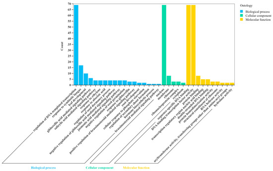 In order to further explore biological functions of the HcGRAS TF family, this research annotated 78 HcGRAS genes’ proteins (Figure 7 and Table S6). It was found that 69 HcGRAS genes were annotated and assigned to three broad categories, which were biological process (BP), cellular component (CC), and molecular function (MF). For the high enrichment of HcGRAS genes for organic cyclic compound binding and nucleic acid binding, the HcGRAS TF family is found to contribute much to affecting transcription regulation. Among cellular components, HcGRAS genes were enriched in the nucleus and membrane. In biological processes, mediated signaling pathways, responses to hormonal and environmental stimuli, growth and development processes, and biomass synthesis were enriched with more HcGRAS genes. Among them, growth and development processes, including dormancy processes, tissue development and plant organ development, environmental stimulus responses, including responses to symbiotic fungus and phosphate starvation responses, and hormonal stimulus responses, including SA, GA, ABA, brassinosteroid and JA signaling pathways, all indicate that the HcGRAS TF family is likely to adapt plants to different environments. Furthermore, KEGG enrichment analysis demonstrated that 32 out of the 78 identified GRAS genes were significantly associated with the specific signaling pathway related to plant hormones (Table S7).