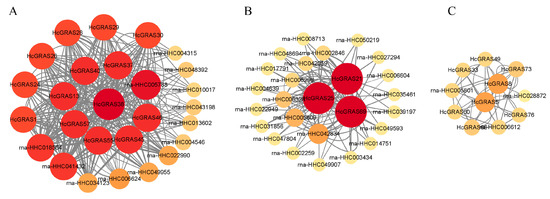 An analysis of the interaction network among 78 HcGRAS proteins indicated that 25 of these genes established interactions, while interaction relationships were not formed in 53 genes (Figure 8). Figure 8A implies that those proteins are crucial and the DELLA subfamily members HcGRAS1, HcGRAS24, HcGRAS28, HcGRAS38, HcGRAS40 and HcGRAS55, which is a family of proteins that regulate an adverse environment by interacting with GA. The other proteins, all of which belong to the SCR, OS4, LS, and SHR subfamilies, interact with them, particularly the HcGRAS38 protein, serving as the core connecting DELLA proteins, which indicates that its role is necessary for the DELLA subfamily. HcGRAS21, HcGRAS25 and HcGRAS69, which belong to the SCL8 subfamily, are the key factors of protein interaction in Figure 8B, and they can interact with many proteins in daylily. In Figure 8C, HcGRAS5 and HcGRAS8, which belong to the SCR subfamily, play an important role in the PPI network. Meanwhile, HcGRAS33, HcGRAS49, HcGRAS60, HcGRAS66, HcGRAS73, and HcGRAS76, which belong to the SHR subfamily, suggest that there is a protein interaction relationship between SHR and SCR subfamilies.