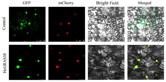 In order to confirm the expected subcellular localization of HcGRAS38, daylily HcGRAS38-GFP was co-expressed with the nucleus marker (mCherry) vector, subsequently transferring the recombinant plasmid into Agrobacterium tumefaciens, and we injected it into N. benthamiana. After a period of 48 h, observations were made with a confocal laser scanning microscope, revealing that HcGRAS38 was localized to the nucleus (Figure 9).