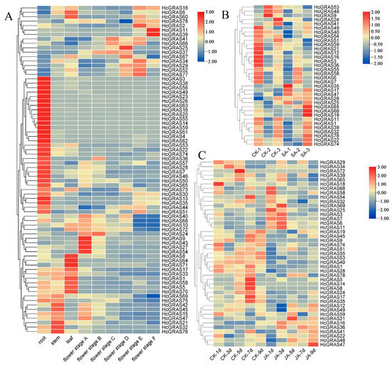 Analysis of expression patterns in HcGRASs. (A) Heatmap illustrating the expression profiles of 78 HcGRAS genes at various stages of floral development. (B) Expression patterns of HcGRASs under salicylic acid treatment. (C) Expression patterns of HcGRASs under jasmonic acid treatment. Different colored boxes exhibit row-scaled FPKM values, with expression gradually increasing from blue to yellow to red at a time.